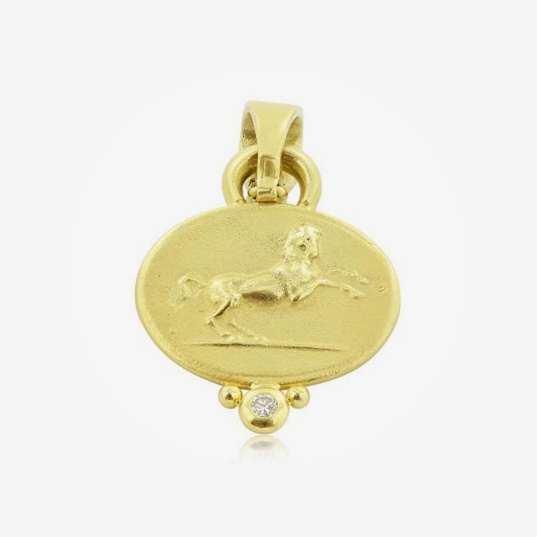18 karat oval cameo pendant depicting image of a horse with 0.05 carat round diamond.