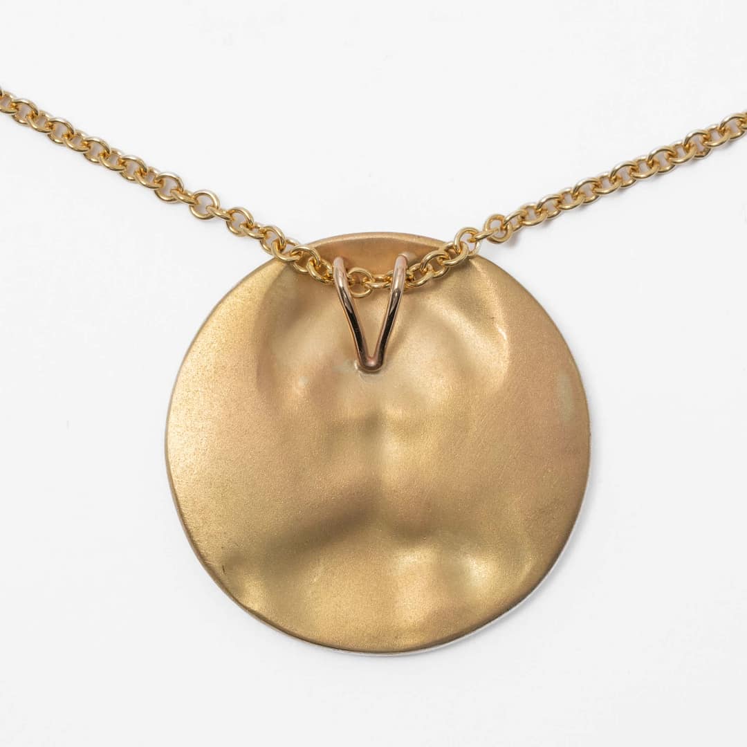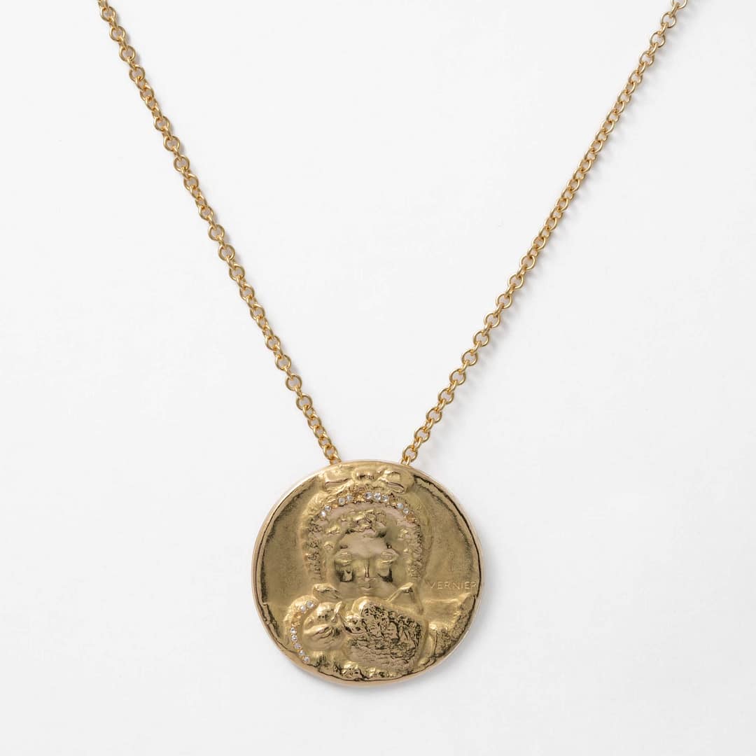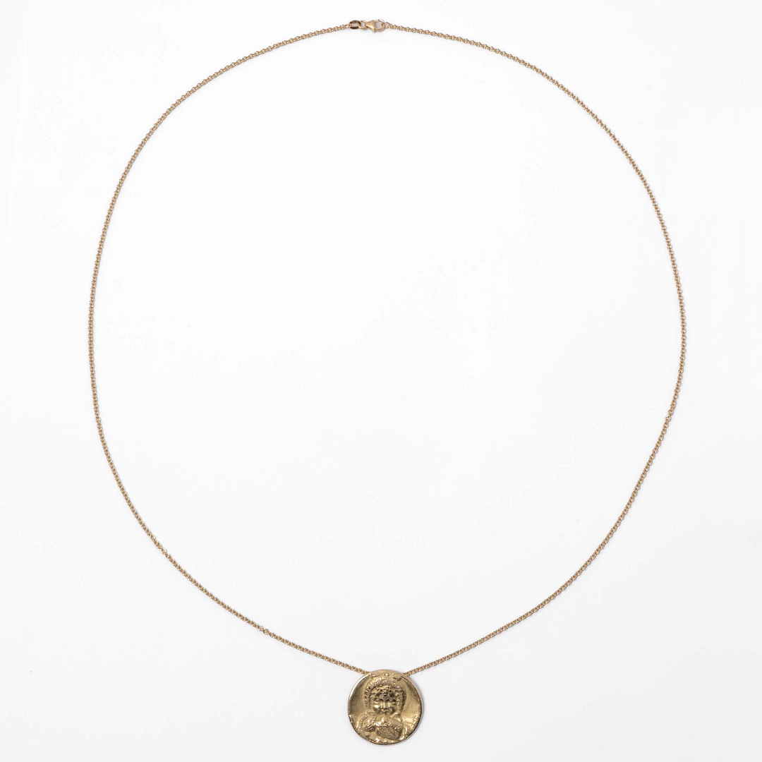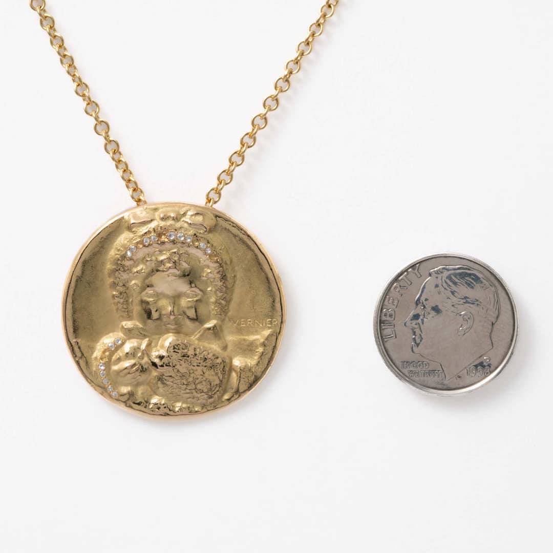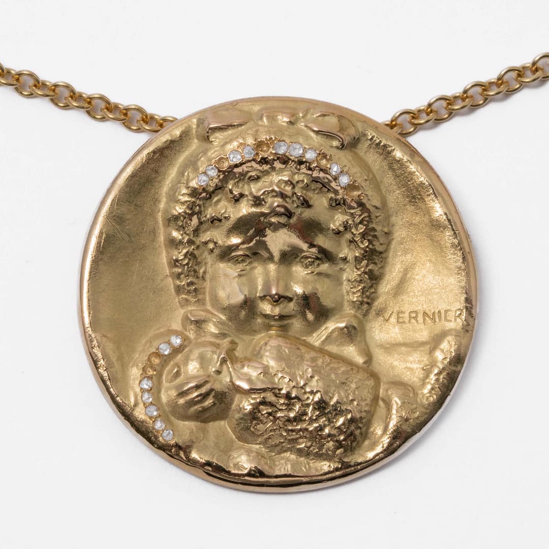 French Art Nouveau Pendant Necklace of Child Holding an Apple (Yellow Gold)