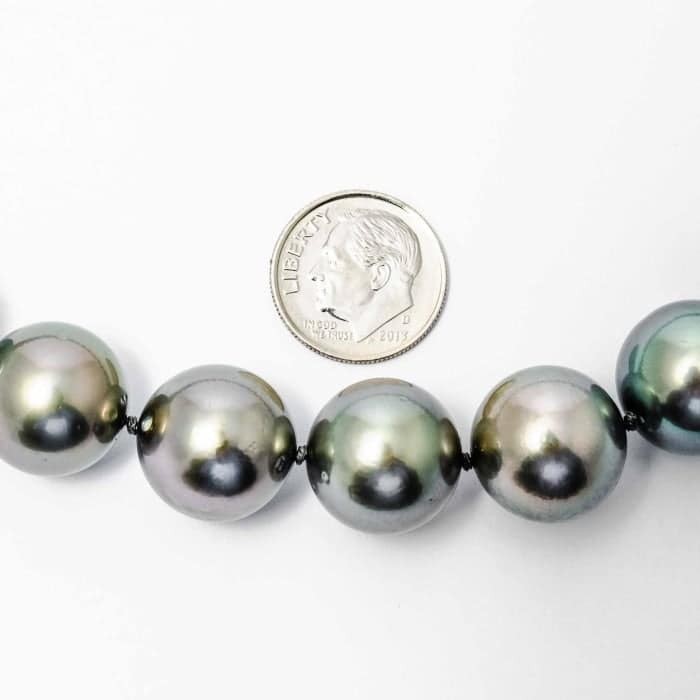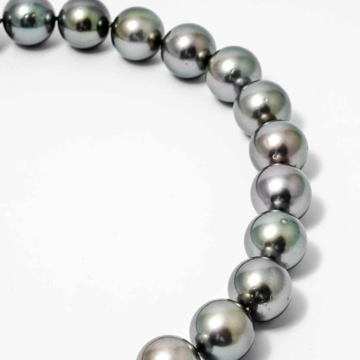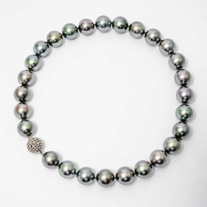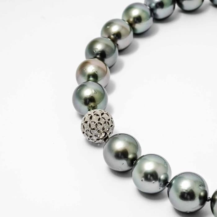 1 strand of 27 large black Tahitian pearls graduating from 15-16mm, accented by a 14 karat white gold filigree style ball clasp. This necklace measures approximately 18 inches in length.