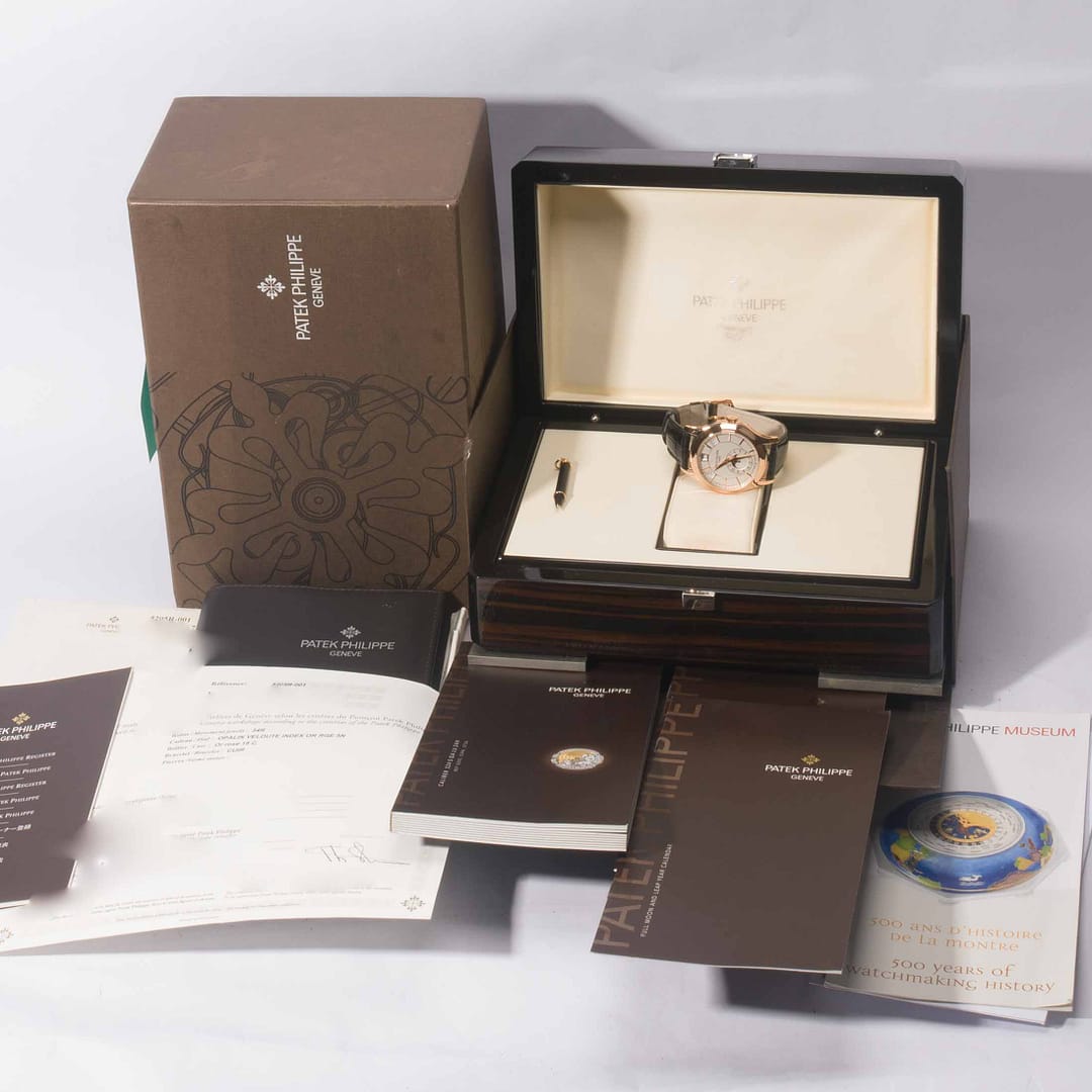 Condition Report: This Patek Philippe is in excellent to mint condition, and comes complete with all original box, papers, certificate of origin (dated Dec. 2016) patek setting pin, etc…The Patek 5205R-001 was produced from 2013 until it was discontinued in 2022. The 5205R-001 is sold out, discontinued and unavailable via Patek Authorized Points of Sale. Last Known MSRP approx.. $58,000.00 USD