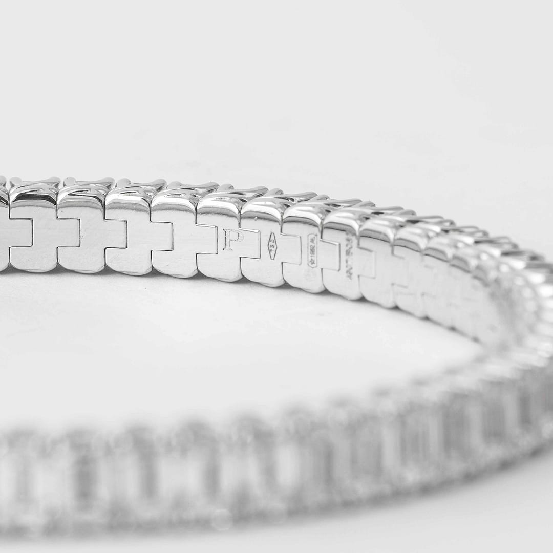 This extraordinary 18K white gold expandable tennis bracelet by Picchiotti features 60 emerald-cut diamonds weighing a total of 18.95 carats, with F-G color and VVS clarity. The innovative expandable design ensures a perfect fit, offering comfort without compromising elegance. The clean lines of the emerald cuts create a sophisticated and timeless aesthetic. A breathtaking piece of craftsmanship, perfect for marking life’s most significant moments.