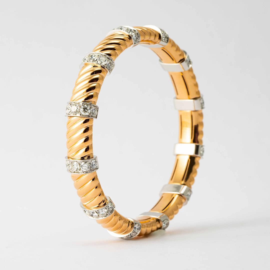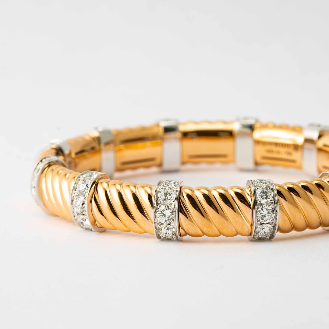 This 18kt rose and white gold Picchiotti Xpandable bracelet is a true testament to meticulous Italian craftsmanship. The bracelet features a captivating twisted design set with twelve segments of 60 round diamonds, amounting to a total weight of 6.50 carats. Its versatile design ensures a perfect fit while providing an exquisite touch to your ensemble. This piece embodies luxury, grace, and elegance. To truly appreciate the sparkle and quality of this bracelet, we invite you to visit our Shreve, Crump & Low store in Boston, Massachusetts.
