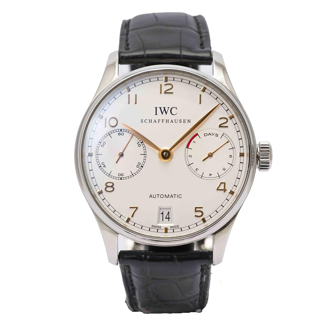 Preowned IWC Portuguese Automatic 7-Day Silver Dial w. Gold Markers Stainless Steel 42.3mm (IW500114)