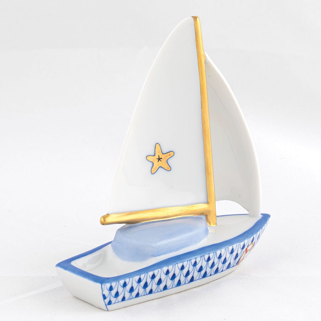 Martin’s Herend fine white porcelain hand painted sailboat at sea figurine in the color blue with gold accents.