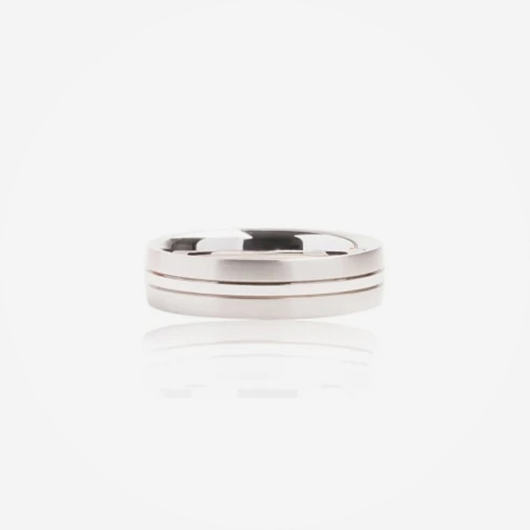 18 karat white gold 6mm wedding band featuring a high polished striped center with smooth satin finishing. Size 10