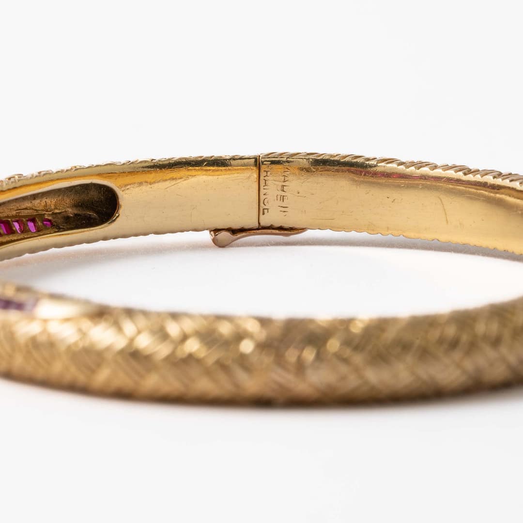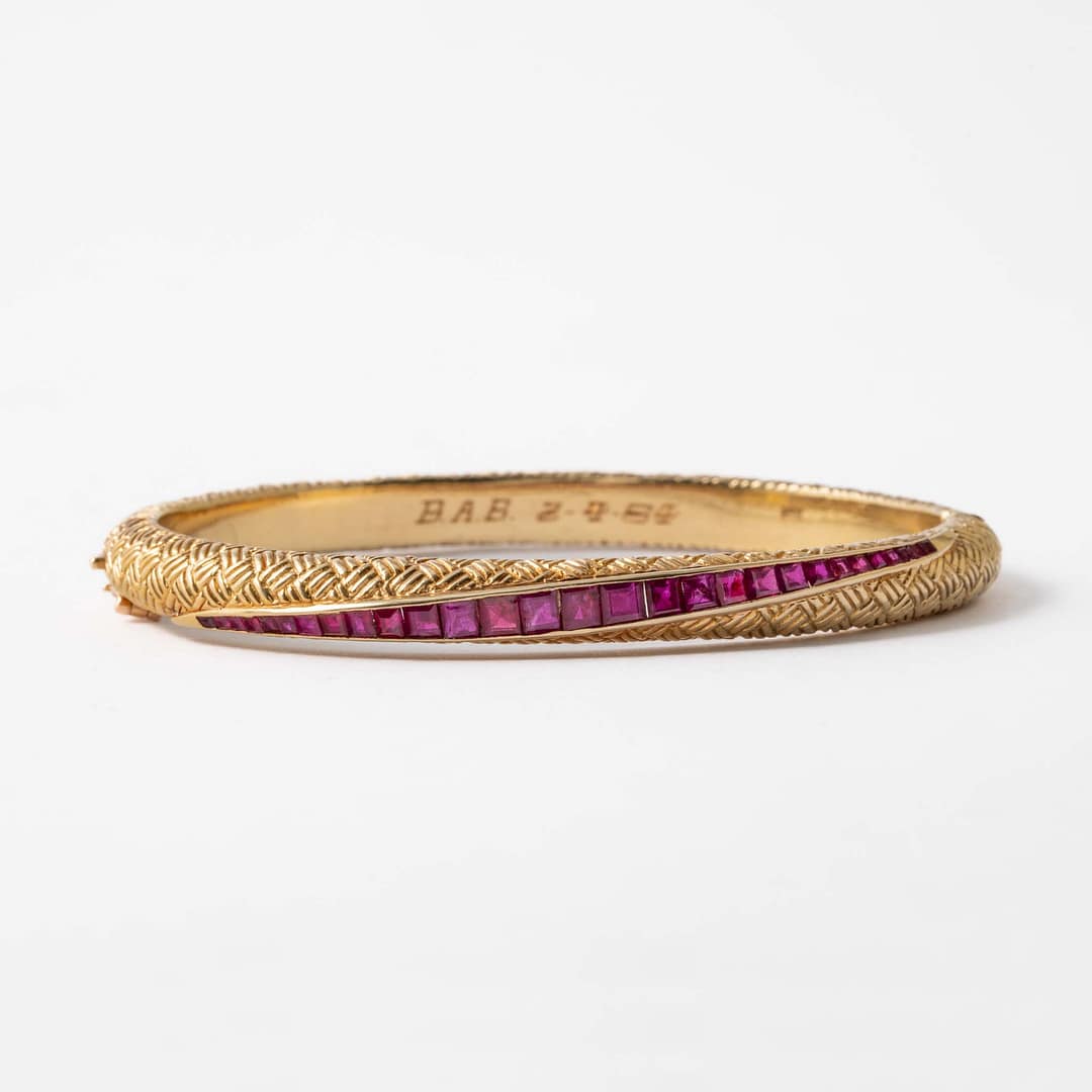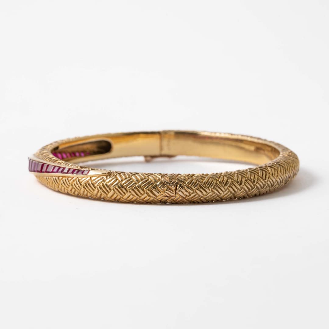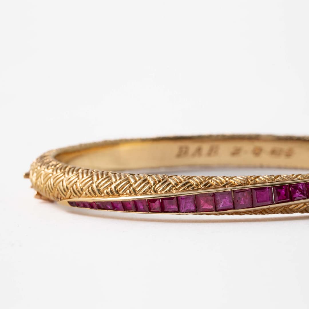 18 karat yellow gold textured bangle bracelet consisting of a curved channel set row of square cut rubies.