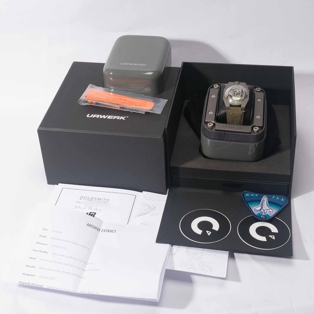 This genuine Urwerk is in excellent condition. Watch has been inspected and tested prior to sale, movement functioning as normal. Watch includes original Urwerk box, papers, and warranty card (undated). Watch originally sold in Oct. 2021. Comes with extra Urwerk Orange Textile Strap. Limited Edition of 20 pieces. This specific limited edition Urwerk is sold out discontinued and Unavailable via Urwerk Authorized Points of sale. *Original MSRP approximately $61,000.00 USD