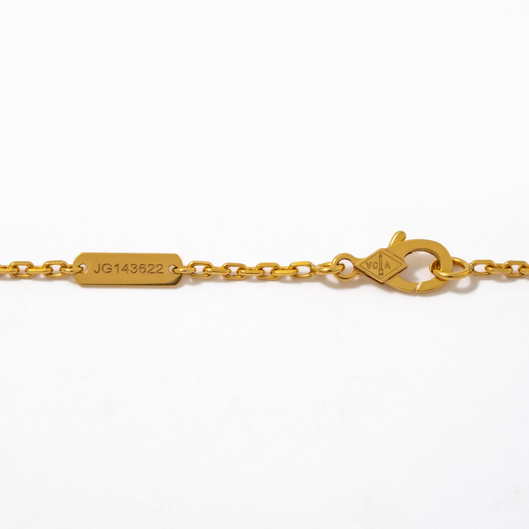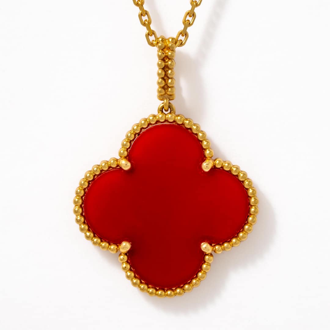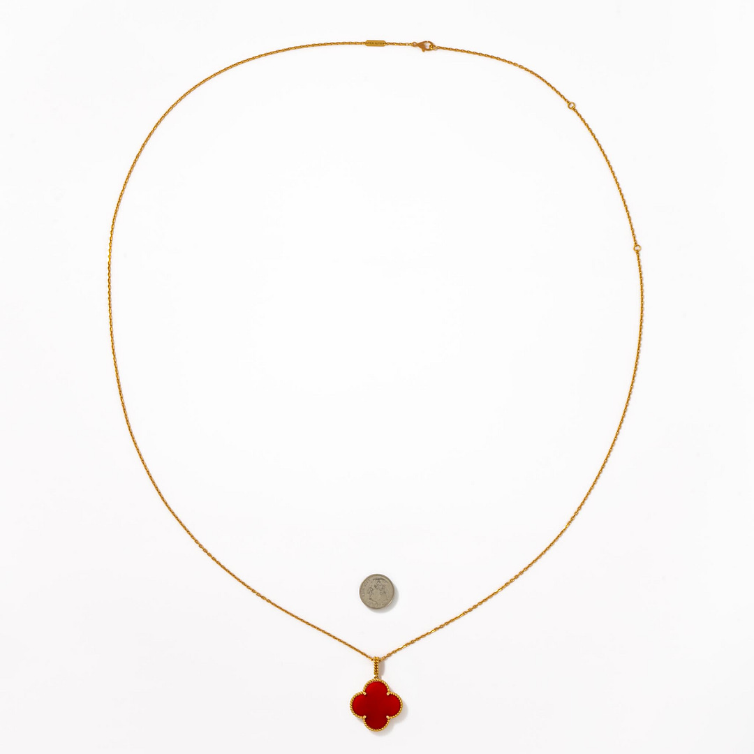 Crafted in 18 karat yellow gold, this 38-inch Van Cleef & Arpels Magic Alhambra pendant showcases a luminous carnelian motif known for its warm, glowing hue. The elongated length offers versatile styling, allowing the necklace to be worn long or doubled for a layered look. Included are the Van Cleef & Arpels box, certificate of authenticity dated 5/2/2024, polishing cloth, and serial number JG143622. A striking combination of color and elegance, this piece reflects the playful yet refined spirit of the Magic Alhambra line.