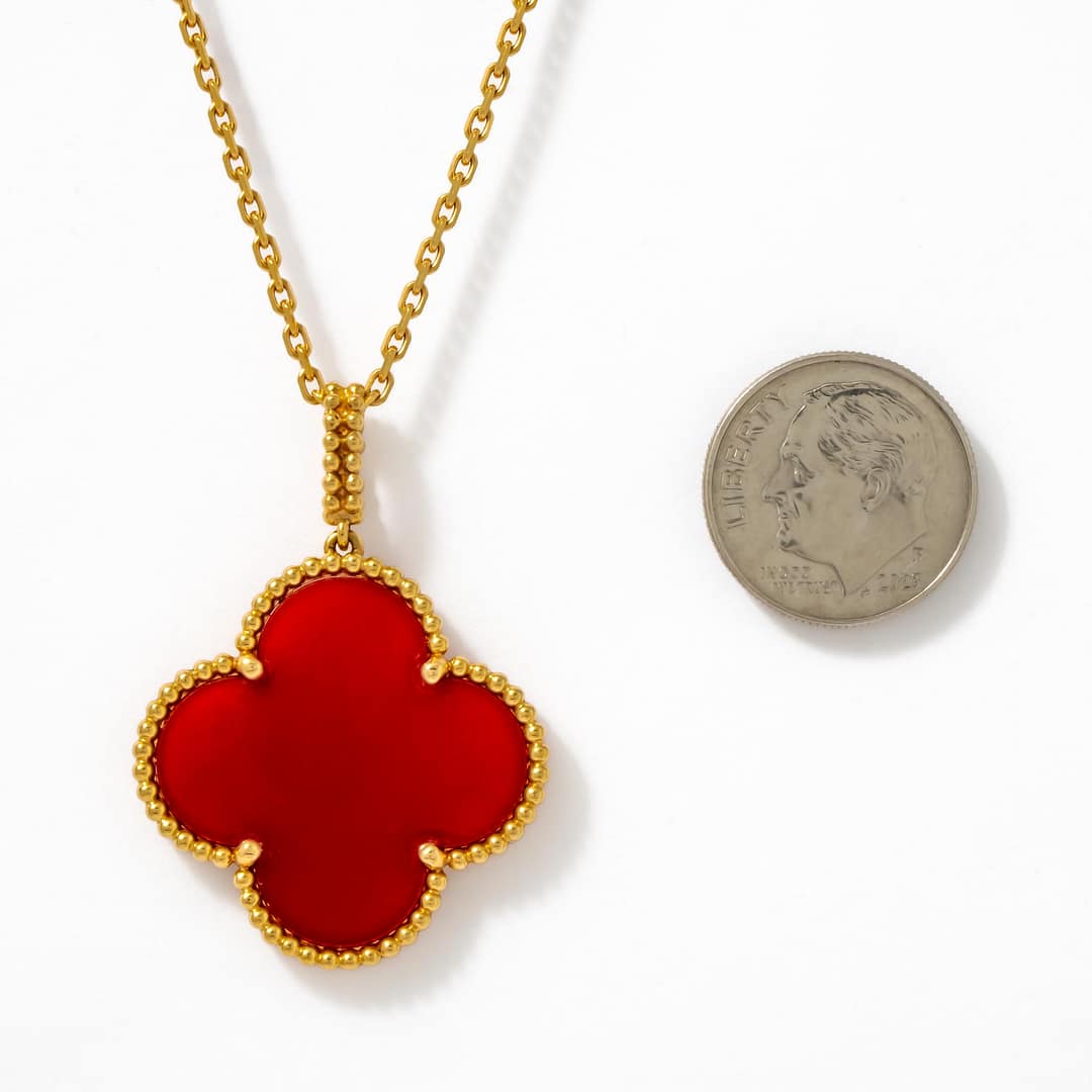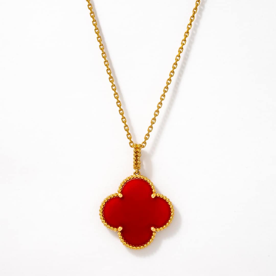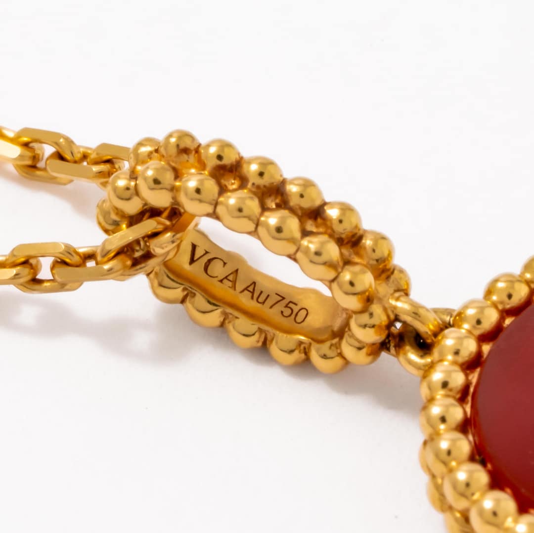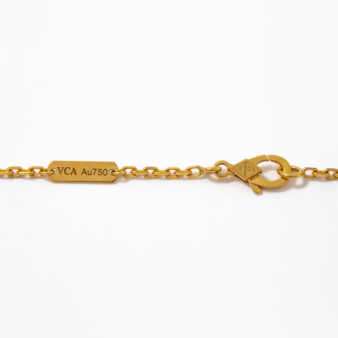 Crafted in 18 karat yellow gold, this 38-inch Van Cleef & Arpels Magic Alhambra pendant showcases a luminous carnelian motif known for its warm, glowing hue. The elongated length offers versatile styling, allowing the necklace to be worn long or doubled for a layered look. Included are the Van Cleef & Arpels box, certificate of authenticity dated 5/2/2024, polishing cloth, and serial number JG143622. A striking combination of color and elegance, this piece reflects the playful yet refined spirit of the Magic Alhambra line.