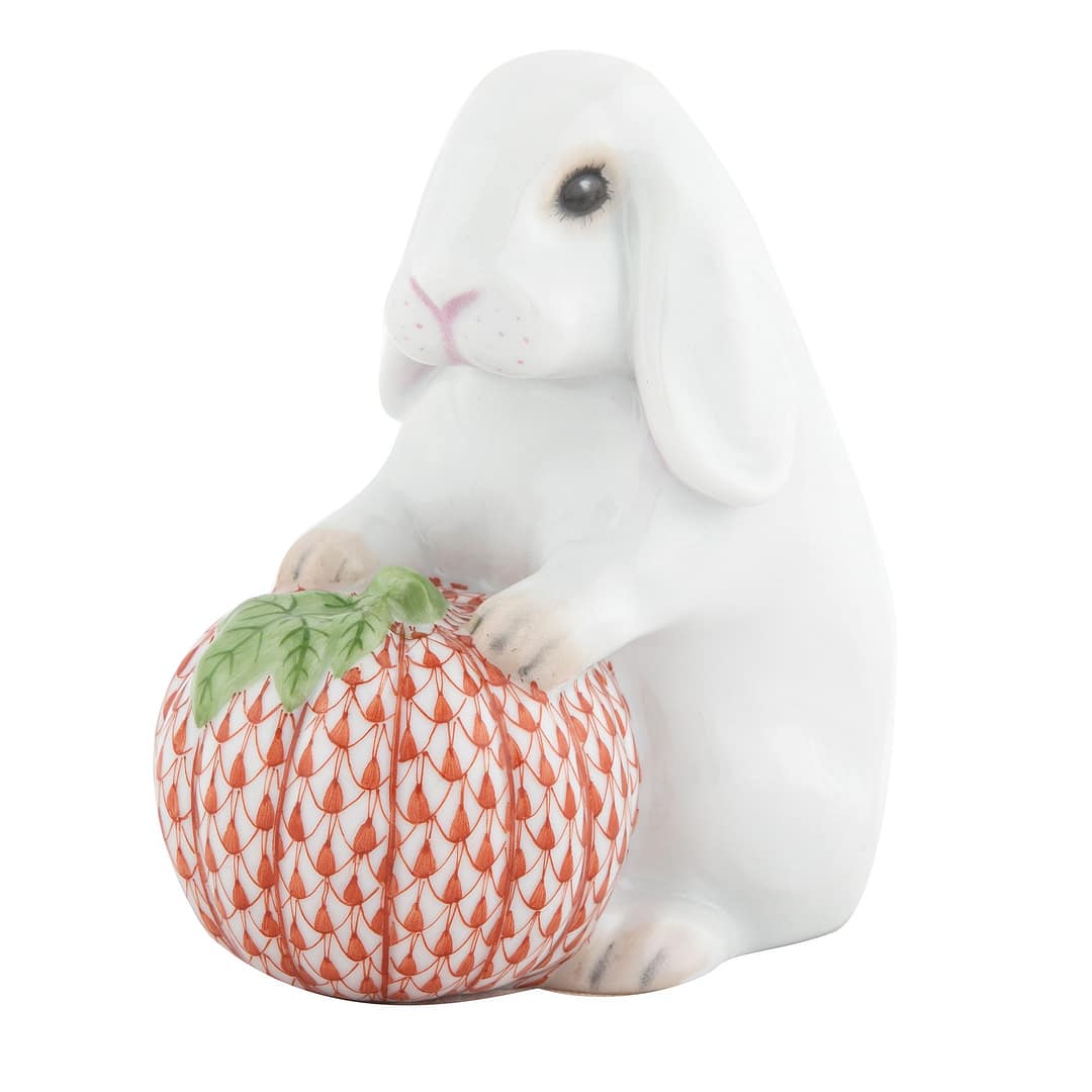 Martin’s Herend poreclain hand painted white autumn bunny figurine holding a hand painted pumpkin both accented with gold.